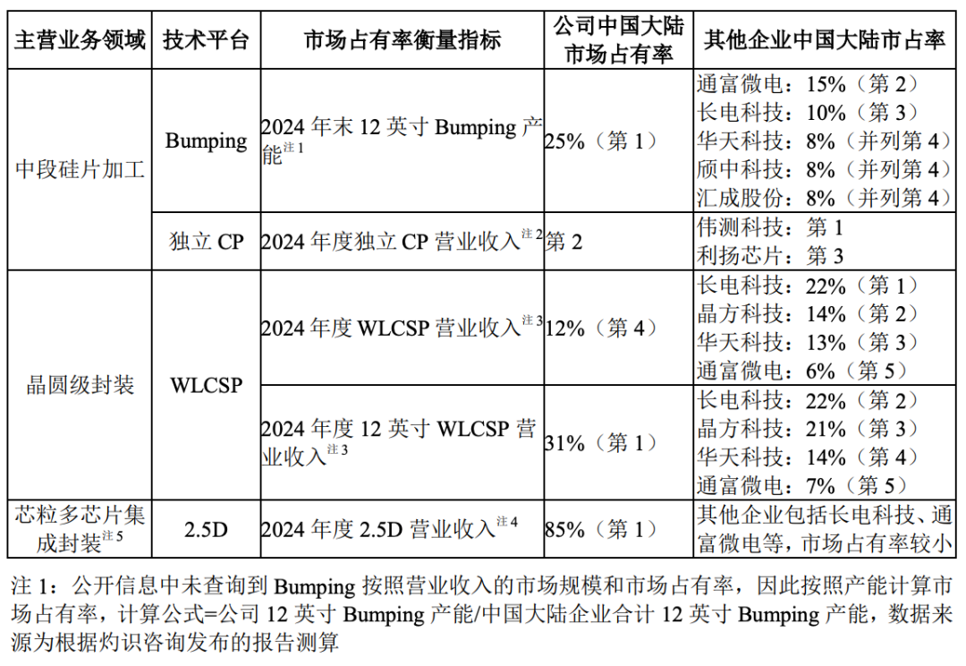 根据灼识咨询的统计,截至2024年末,盛合晶微是中国大陆12英寸Bumping产能规模最大的企业;2024年度,盛合晶微是中国大陆12英寸WLCSP收入规模和2.5D收入规模均排名第一的企业。