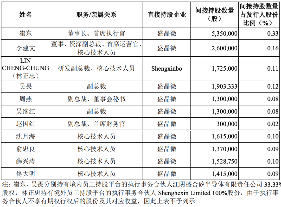 截至2025年6月30日,盛合晶微董事、高级管理人员、其他核心人员及其近亲属间接持有公司股份的情况如下表所示: