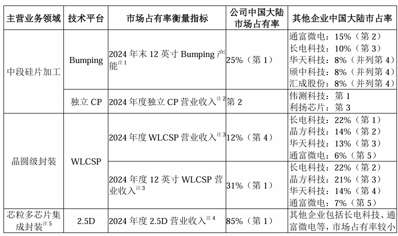在主营业务领域中,发行人已大规模向客户提供的各类服务均在中国大陆处于领先地位。根据灼识咨询的统计,截至2024年末,发行人是中国大陆12英寸Bumping产能规模最大的企业;2024年度,发行人是中国大陆12英寸WLCSP收入规模和2.5D收入规模均排名第一的企业。