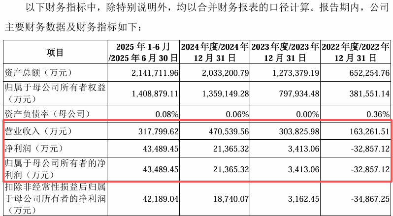 报告期内,盛合晶微营业收入分别为163,261.51 万元、303,825.98 万元、470,539.56万元和317,799.62 万元,2022年至2024年复合增长率达69.77%;归母净利润分别为-32,857.12 万元、3,413.06 万元、21,365.32 万元和43,489.45 万元。