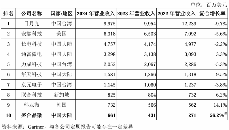 根据Gartner 的统计,2024 年度,盛合晶微是全球第十大、境内第四大封测企业,且公司 2022 年度至2024年度营业收入的复合增长率在全球前十大企业中位居第一。
