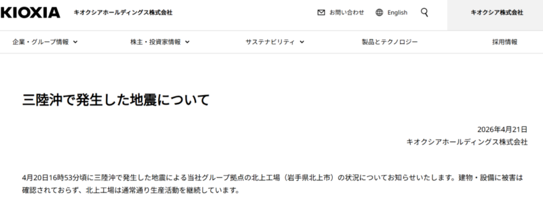 铠侠位于岩手县北上市有Fab 1、Fab 2两座工厂。铠侠在震后发文称,就4月20日16时53分左右发生于三陆近海的地震对本公司集团旗下北上工厂(岩手县北上市)造成的影响通报如下:目前尚未确认建筑物及设备受损,北上工厂的生产活动正在照常进行。
