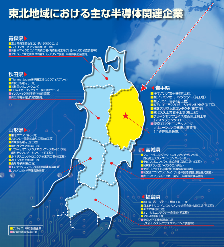 根据岩手县官方发布的半导体相关企业地图,此次受地震影响区域主要半导体相关企业如下(相关企业名称根据报告翻译,实际情况以原报告为准):