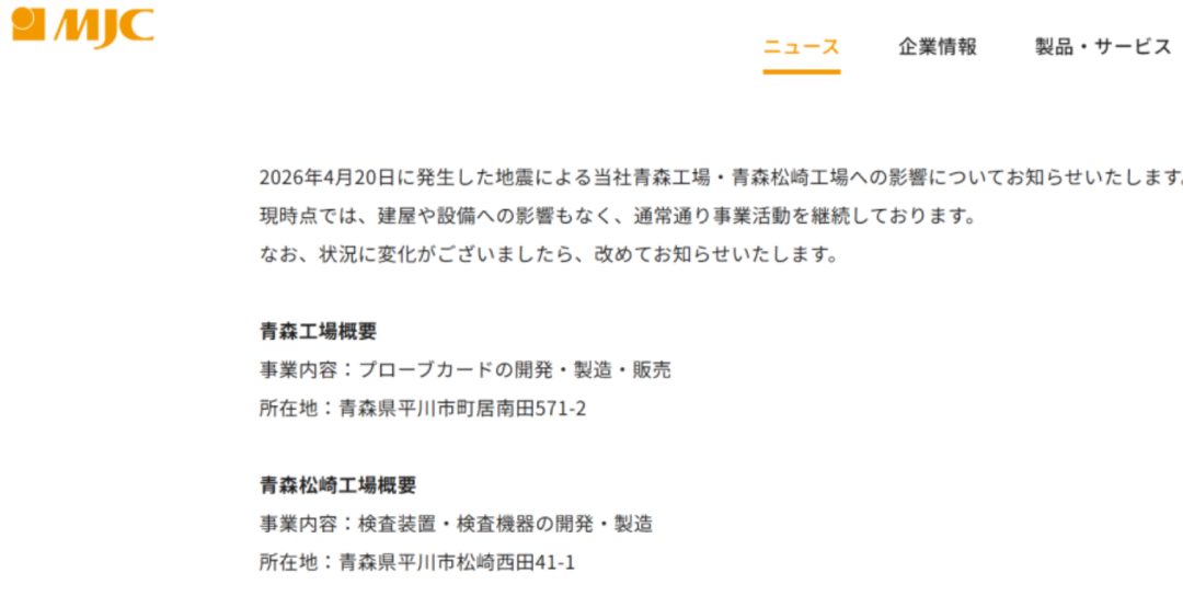 MJC旗下青森工厂、青森松崎工厂的厂房、设备未受地震影响,现阶段持续如常进行营运(如常生产)。MJC青森工厂从事探针卡的研发、制造、销售;青森松崎工厂从事测试设备/测试装置的研发、制造。