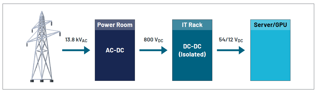 图2:端到端数据中心电源架构---从13.8千伏交流电网输入,到约800伏直流中间母线,再经隔离式DC-DC转换至54/12伏输出线路。新一代AI电源机架需要额定电压超过800伏的专用大功率测试设备,以验证数百千瓦级别的PSU