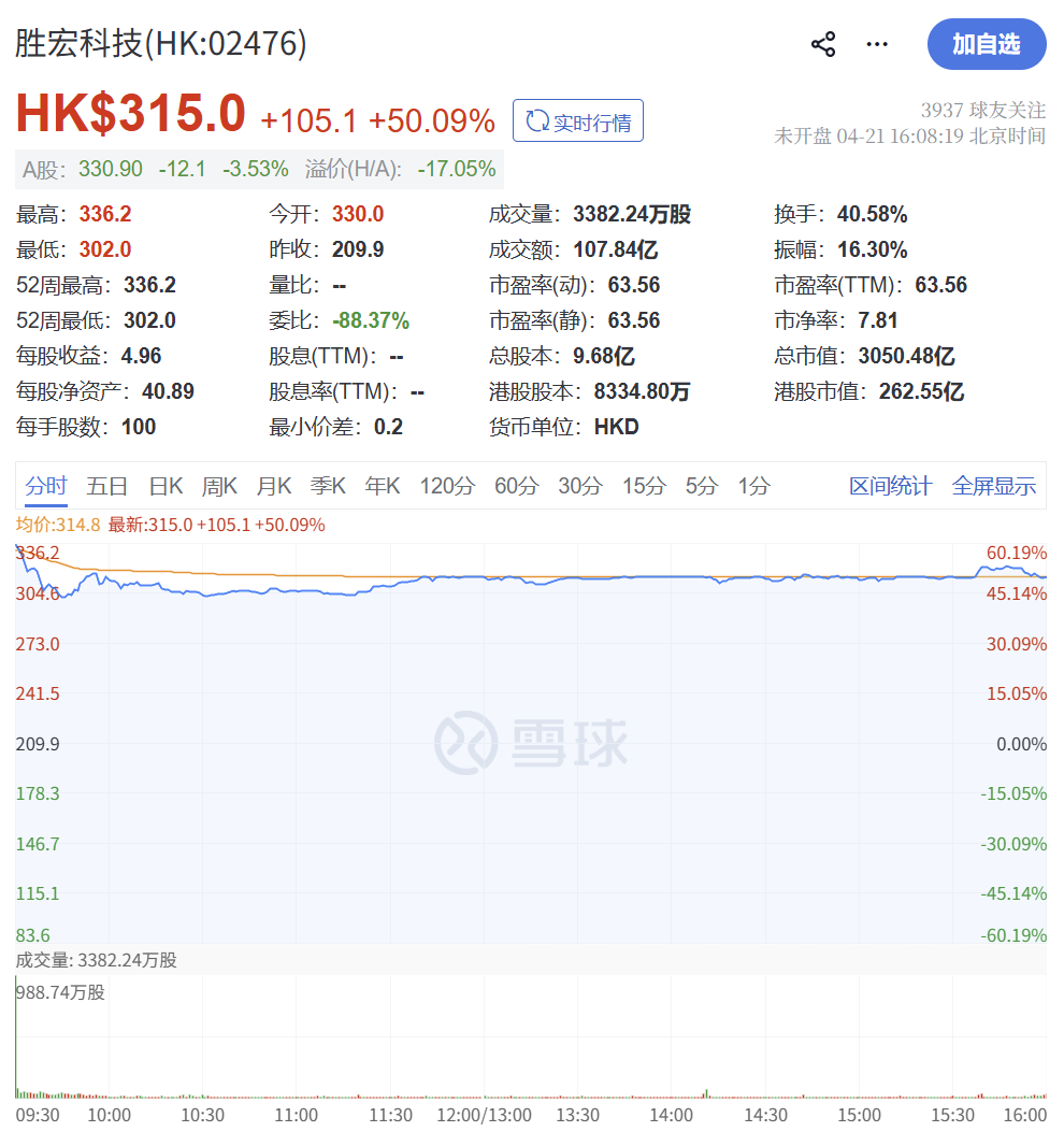 上市首日,胜宏科技股价表现惊艳,以315港元/股收盘,较发行价209.88港元大涨50.09%,盘中最高涨幅一度超过60%,总市值突破3000亿港元,达到约3598亿港元。