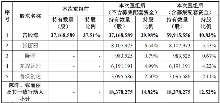 重组完成后,若不考虑配套募资,宫殿海持股比例将由37.51%降至29.98%;若考虑配套募资,其持股比例将升至40.83%。此外,时空科技将新增持股超5%的股东张丽丽。宫殿海已承诺,因本次募集配套资金所获新发行股份自发行结束之日起36个月内不得转让。由于交易后宫殿海持股比例进一步提高并触及要约收购线,公司董事会已同意提请股东会批准其免于发出要约。