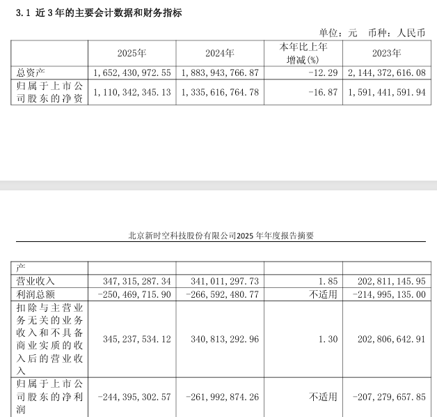财务数据显示,2021年至2025年,时空科技归母净利润分别亏损1771.4万元、2.09亿元、2.07亿元、2.62亿元、2.44亿元;扣非净利润亦连续为负,2025年扣非净利润为-2.65亿元。营收方面,2022年至2025年营业收入均低于3.5亿元,其中2023年仅为2.03亿元。