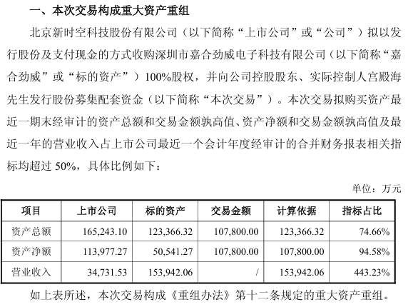 4月17日晚间,时空科技同步披露2025年年度报告与重大资产重组草案,公司拟通过发行股份及支付现金方式,作价10.78亿元收购深圳市嘉合劲威电子科技有限公司(简称"嘉合劲威")100%股权,并向控股股东、实际控制人宫殿海发行股份募集配套资金。本次交易构成重大资产重组。