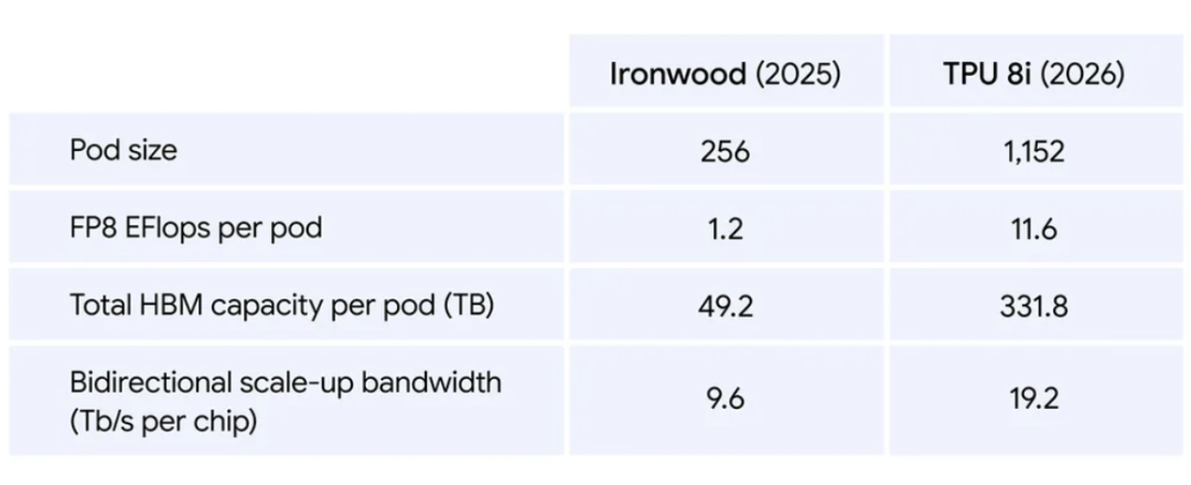 TPU 8i首次由谷歌和联发科合作设计,专注于AI推理场景,旨在消除“等待室效应”——即用户请求被有意排队或延迟以实现硬件利用率最大化的情况。单个Pod可扩展至1,152块芯片,提供11.6 exaflops FP8计算性能,较Ironwood同等价格下性能提升80%,每瓦性能较上一代提升117%。