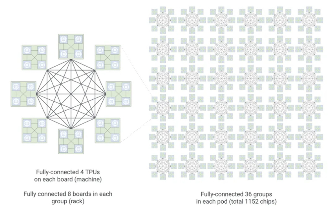 Boardfly采用分层设计:4颗芯片环形互联构成基础单元,8块板卡通过铜缆全互联构成本地算力组,36个算力组通过光开关互联构成最高1024颗芯片的集群。