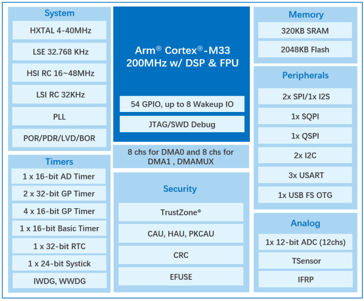 芯片集成TrustZone®安全架构,打造硬件级安全防护体系,支持MPU、SAU双层访问控制,从内核层面筑牢安全屏障。内置2Kbits eFuse实现安全密钥存储,集成TRNG真随机数发生器及SHA、DES/3DES、AES、RSA/DH、ECC等全系列硬件加密算法,满足各类密码学运算与高安全等级应用需求。同时芯片支持安全启动、安全存储、安全调试与安全升级全流程防护,搭配独立UID,实现设备全生命周期的安全管理与身份认证。