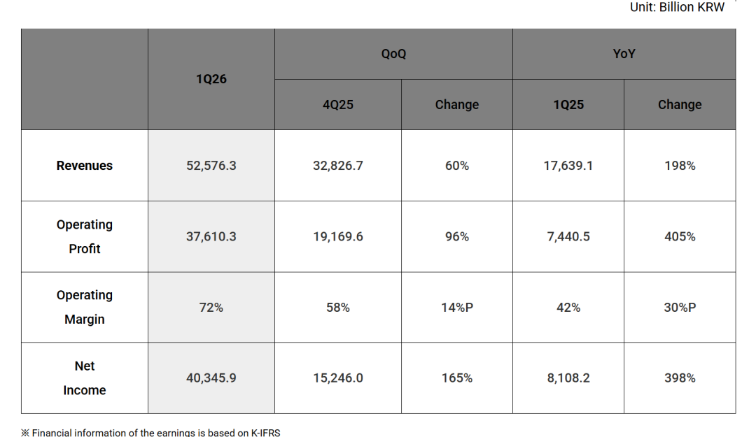 从季度业绩来看,销售额首次突破 50 万亿韩元大关,营业利润为 37.6 万亿韩元,营业利润率达到 72%,创下公司成立以来的最高纪录,营业利润环比激增约两倍。