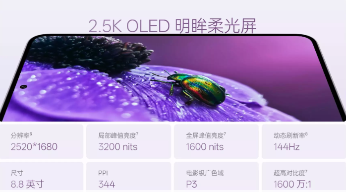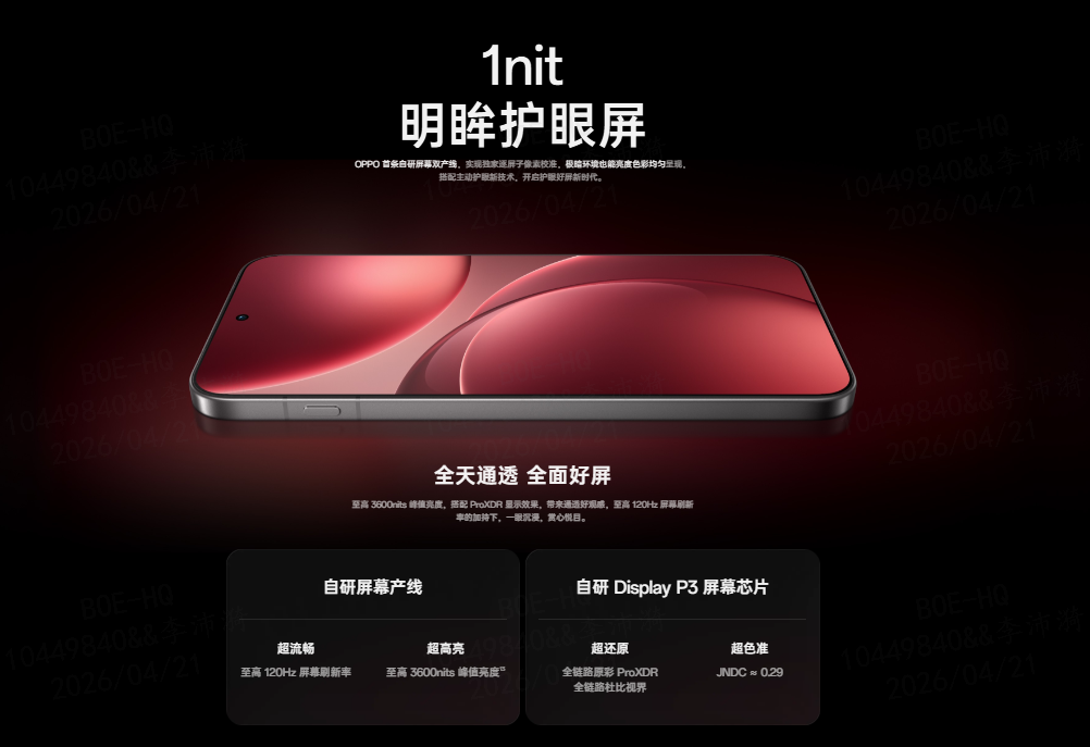 色彩方面,广色域覆盖与精准色彩还原,画面鲜艳不失真。契合影像级功能需求,确保摄影、剪辑等专业场景下的精准还原色彩与细节;清晰度方面,2K分辨率,像素密度超500PPI,带来“视网膜级”细腻观感,无颗粒感与油污感;层次方面,灰阶过渡自然平滑,明暗变化丰富,画面立体感强,避免“灰蒙感”与断层,让每一帧画面都更具纵深感;动态范围方面,亮部更明亮、暗部更纯净,即使在强光下也能保持画面通透,明暗细节清晰可辨。此外,OPPO Find X9 Ultra还集成了京东方全场景护眼与低功耗优势:2160Hz全亮度高频PWM调光、并搭载全场景1nit暗光护眼及京东方圆偏振光技术,有效缓解视觉疲劳;此外,该屏幕还采用了LTPO自适应刷新技术支持1-144Hz智能动态刷新率,可在静态场景和游戏视频场景自如切换,兼顾流畅体验与功耗控制。