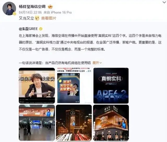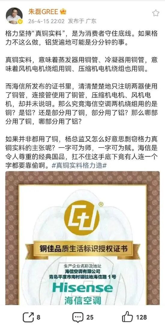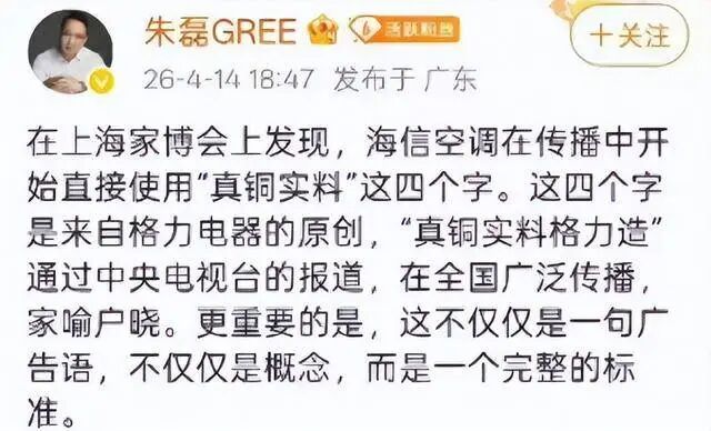 这场争论的导火索出现在一周前。4月14日,格力电器CMO朱磊通过个人微博公开指责海信空调在上海家博会上直接使用格力原创的"真铜实料"四字进行宣传。朱磊定义"真铜实料"为蒸发器、冷凝器、压缩机电机、风机电机四大部件100%全铜,并承诺"在中国市场没有一台使用铝线电机的空调",向海信发起挑战。