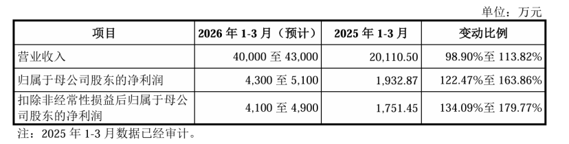 2026年1-3月,预计可实现营业收入约4亿元至4.3亿元,同比增幅约98.90%至113.82%;预计可实现扣除非经常性损益前后归属于母公司股东的净利润同比增幅约为122.47%至163.86%和134.09%至179.77%。联讯仪器称,主要是因为公司所处行业市 场需求快速增长,主要客户业务发展势头良好,公司持续满足客户需求,经营规模持续增长,盈利能力稳步提升。