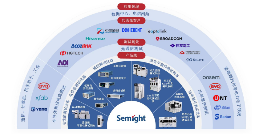 在半导体集成电路领域,联讯仪器主要为用户提供电性能测试仪器及设备。电性能测试仪器方面,核心产品精密源表最小电流分辨率已突破至0.1fA,与国际最高水平的差距持续缩小,且是国内极少数可以提供PXIe插卡式源表、低漏电开关矩阵、高压源表、脉冲源等多产品矩阵的厂商。电性能测试设备产品线主要包括WAT测试机、晶圆级可靠性测试系统等,是国内少数具备精密源表等核心测试部件自主能力的厂商,覆盖比亚迪半导体、燕东微、士兰微、X-FAB等国内外知名企业。