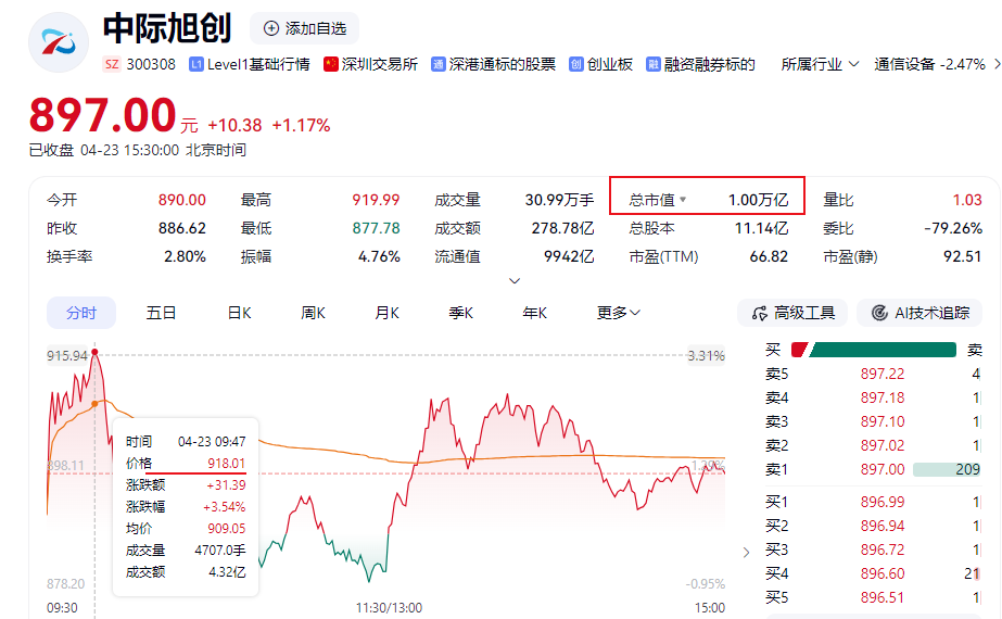 4月23日,A股开盘刚过一分钟,一个历史性的数字牢牢抓住了市场目光: 光模块龙头企业中际旭创股价盘中最高触及919.99元/股,总市值一度突破1.01万亿元。这使其成为A股第14家万亿市值公司、创业板市值第二(仅次于宁德时代),也是山东首只万亿市值鲁股。