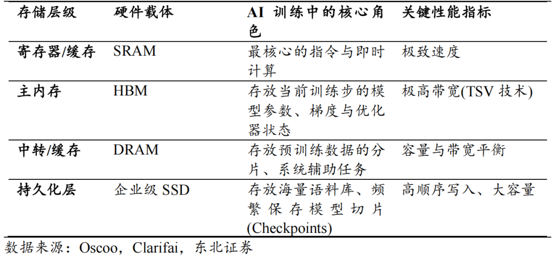 - 训练阶段:依赖极高带宽,HBM 承载模型参数,DRAM 做数据分片缓存,企业级 SSD 存储语料与 Checkpoints。