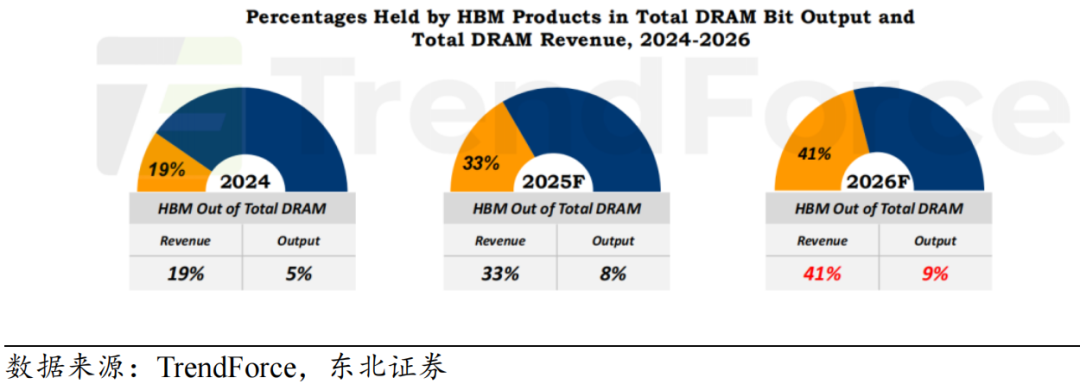2024-2026 年 HBM 占总 DRAM 产出与营收的比例