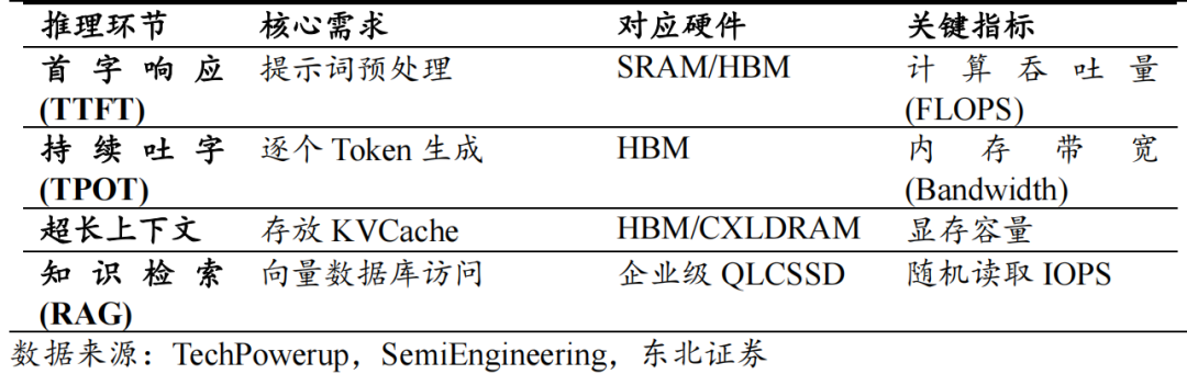 - 推理阶段:受内存带宽约束更强,HBM 承担 KVCache 与持续生成,高速 QLC SSD 支撑 RAG 向量库高并发读取。
