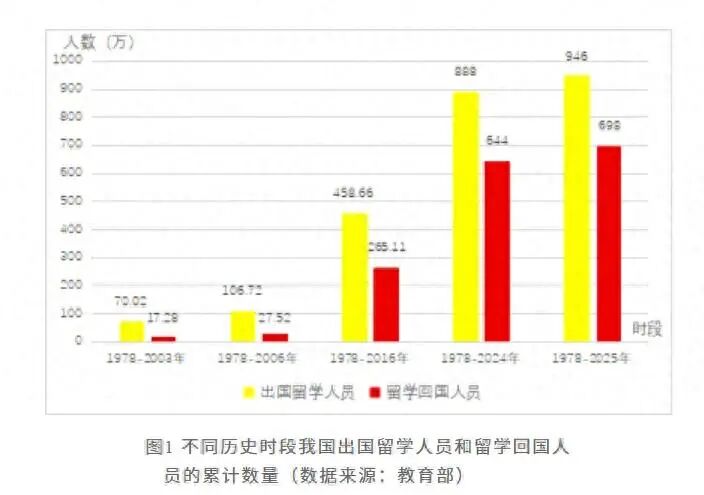 但后续这个比例是越来越高,当时间逐步拉长,我们会发现回国的人数占比会更高,从1978年到2025年,时间跨度高达48年,出国留学人数为946万人,归回人数高达698万,占比达到了73.78%。