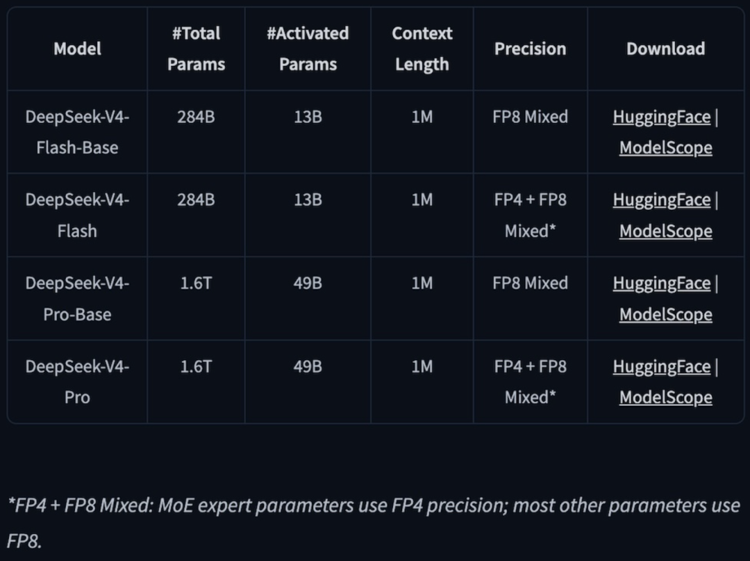 DeepSeek-V4模型采用FP4+FP8混合精度训练,在脱离英伟达生态背景下,其大概率是基于深度定制的内部格式。网友猜测,该模型依托华为昇腾950超节点集群完成训练,从侧面印证华为底层算力架构与低精度混合训练技术,已具备支撑万亿级大模型的能力。▲DeepSeek在Hugging Face上的模型卡