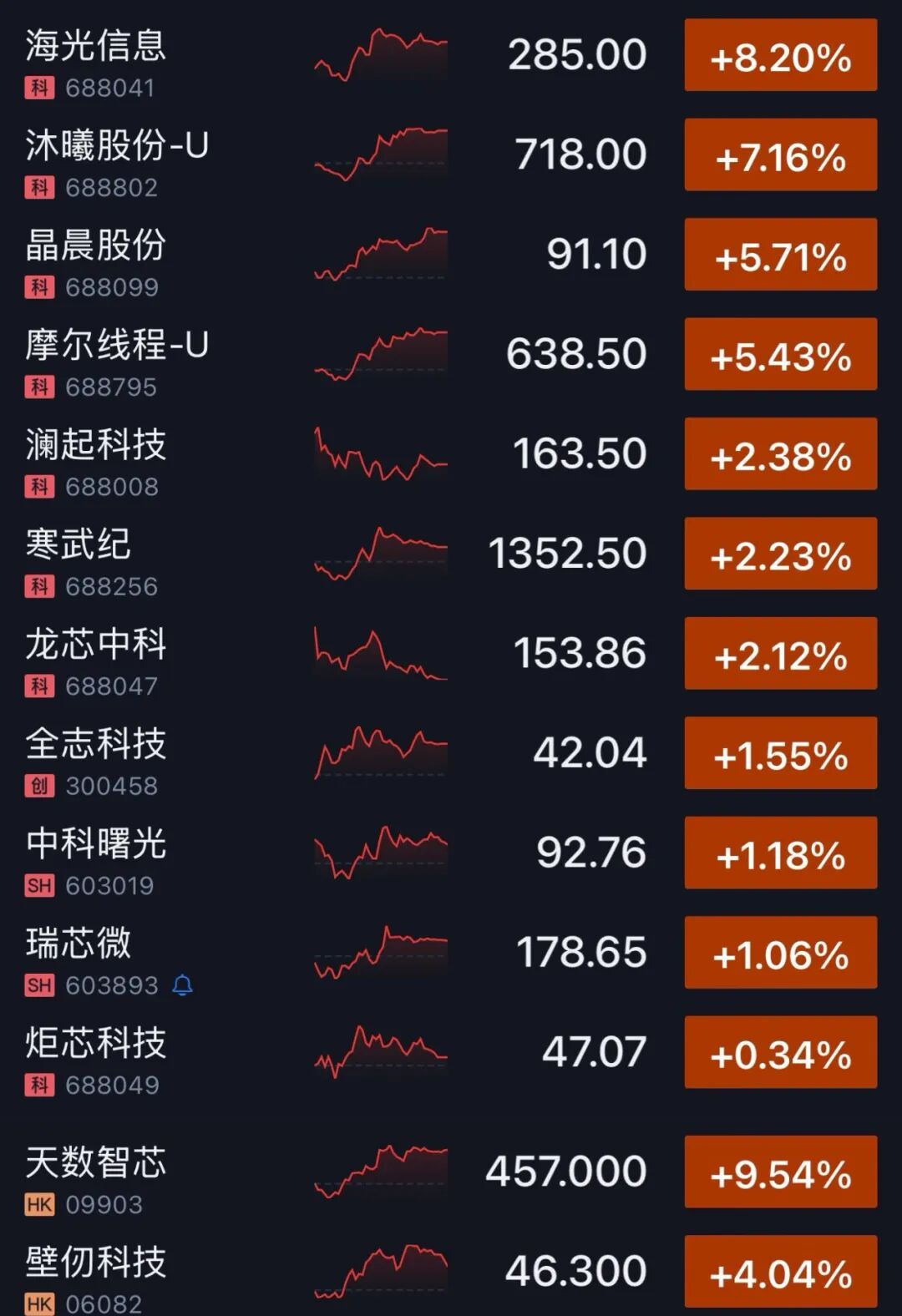 智源研究院众智FlagOS社区在8款AI芯片上适配DeepSeek-V4时,实现了三大技术突破:支持8种以上芯片的全算子替代、解除张量并行最多单机8卡限制、支持从“FP4+FP8混合精度”到BF16的精度转换。截至今日收盘,AI算力板块股价大涨,在A股,海光信息以8.2%的增幅领涨、寒武纪增幅为2.23%,在港股,天数智芯的涨幅达到9.54%。▲AI算力板块股价变化