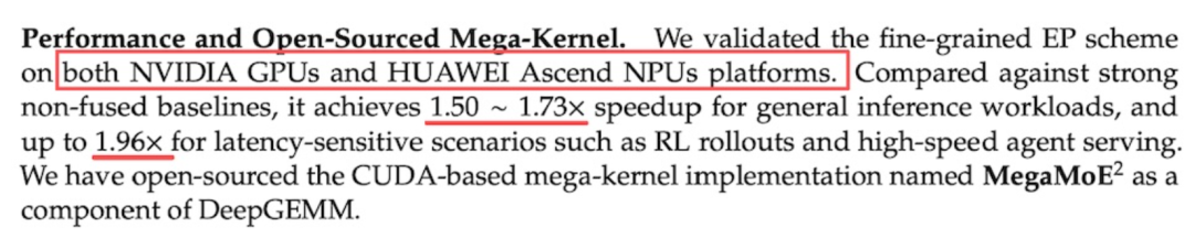 根据DeepSeek-V4技术报告,其并细粒度专家并行(EP)方案同时在英伟达GPU和华为昇腾NPU上完成验证,相比非融合基线在通用推理场景中实现1.50-1.73倍加速,在对延迟敏感的强化学习推演和高速Agent服务场景中最高可达1.96倍。▲DeepSeek-V4技术报告
