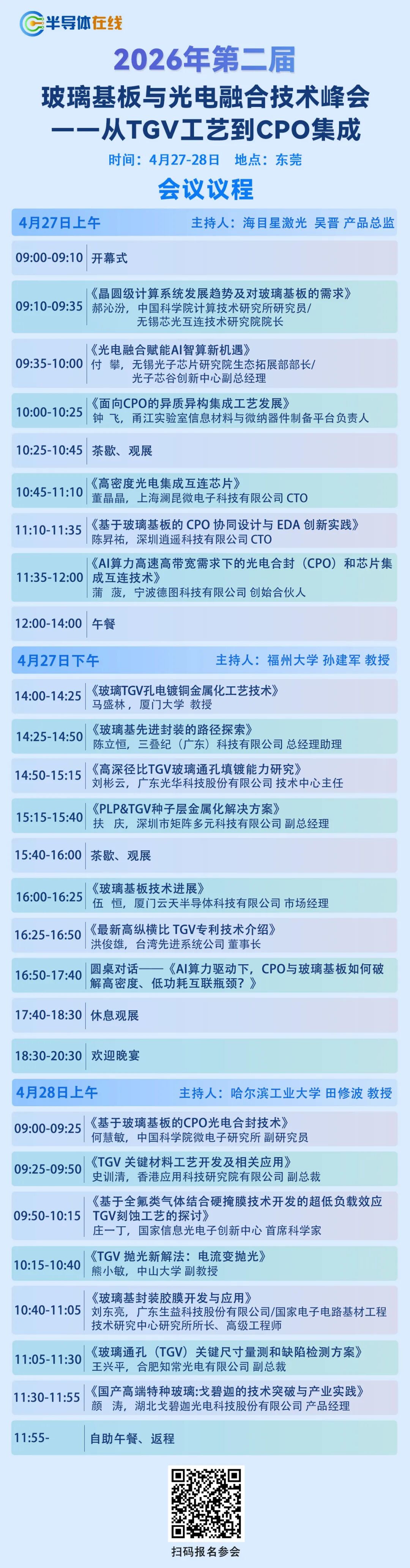 我们将于4月27-28日在东莞举办第二届玻璃基板与光电融合技术峰会——从TGV工艺到CPO集成。本次峰会将汇聚国内外玻璃基板、TGV工艺、CPO技术等领域的知名专家、学者和企业代表,共同探讨行业发展趋势、分享最新研究成果和技术经验。我们诚挚邀请您参与这一盛会,共同见证和推动TGV工艺和CPO 技术等的发展,为未来科技的进步贡献力量。