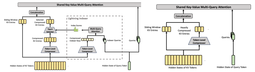 DeepSeek-V4全系标配百万Token超长上下文,其上下文长度达到上一代DeepSeek-V3.2模型的近8倍。首先,DeepSeek-V4采用了混合注意力架构。DeepSeek结合了CSA(压缩稀疏注意力)和HCA(高度压缩注意力),使DeepSeek-V4-Pro在100万Token的上下文设置下,相比DeepSeek-V3.2仅需27%的单Token推理浮点运算量,KV Cache占用量降至前代模型的10%。更轻量的DeepSeek-V4-Flash将效率推至更高水平,其单Token浮点运算量仅为DeepSeek-V3.2的10%,KV Cache占用容量更是低至后者的7%。这一架构升级的核心思路是,CSA先将KV Cache沿序列维度进行压缩,再在压缩后的条目上执行稀疏注意力,仅关注最相关的压缩块。HCA则采用更大压缩率,将每128个Token的KV信息融合为一个条目,但保持稠密注意力,两种机制交替,底层使用CSA保持精细的局部依赖,高层使用HCA大幅压缩远端上下文。▲CSA核心架构(左)、HCA核心架构(右)