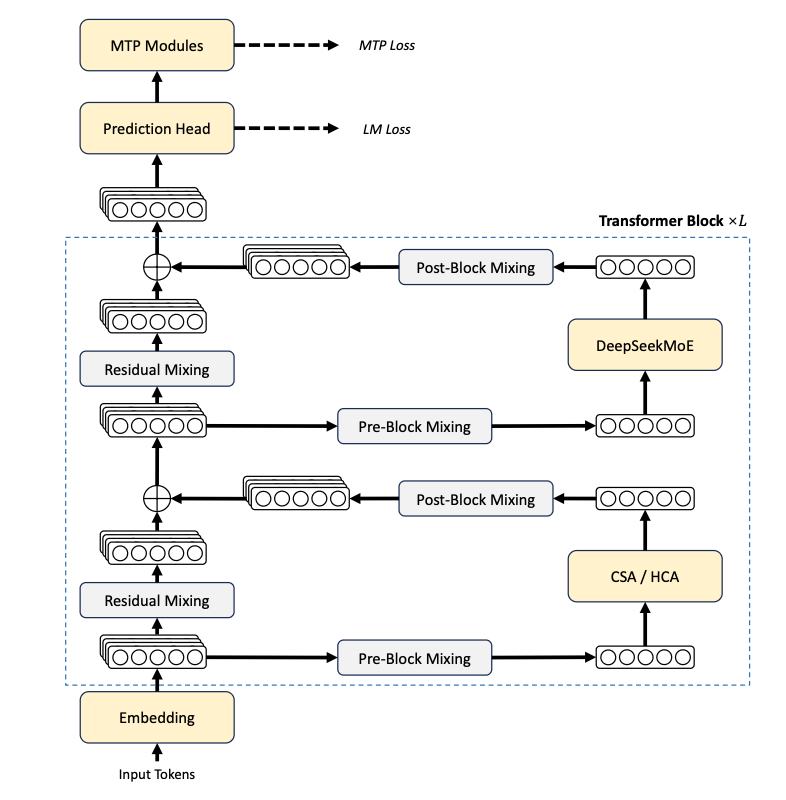 DeepSeek-V4以算法革新打破内存墙,倒逼硬件升级。芯东西4月25日报道,本周五,“国产大模型顶流”DeepSeek-V4开源,其产业影响力火速蔓延:DeepSeek-V4-Pro登顶Hugging Face开源模型榜,A股和港股的AI算力板块全线飘红,国产AI芯片厂家、云巨头、服务器厂家开启密集适配、接入……DeepSeek-V4两款模型DeepSeek-V4-Pro与DeepSeek-V4-Flash,采用MoE架构,总参数规模达到1.6T(激活49B)与284B(激活13B),均支持最长百万Token上下文。昨日,DeepSeek还亮出核心技术底牌,正式发布新模型技术报告,全面拆解新一代架构升级内核、深度优化预训练与后训练全流程体系,公开了全套核心算法与迭代秘籍。扒完这份报告不难发现,DeepSeek-V4以CSA、HCA混合注意力、异构KV Cache、FP4量化感知训练等系统性创新,从算法根源打破“内存墙”,让百万Token长上下文推理真正走向低成本、可规模化的工程落地。算法层面的突破背后,DeepSeek-V4更是用极致压缩架构,反向定义了下一代AI芯片必须走的硬件升级方向:通过差异化存算方案,适配不同数据在带宽、延迟、存储容量上的多元需求。