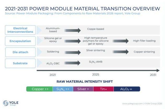 功率模块封装向高性能材料加速转型的关键转变包括:互连材料从铝转向铜基材料、采用银和铜烧结技术进行芯片贴装,以及氮化硅(Si₃N₄)基板日益占据主导地位,以满足新一代电力电子器件在散热和可靠性方面的严苛要求。(来源:Yole Group)