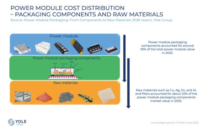 封装组件和原材料占据了电力电子系统成本的重要部分。仅封装部分在2025年就约占功率模块总价值的33%,而铜、银、铝等原材料则占该封装市场价值的25%。(来源:Yole Group)