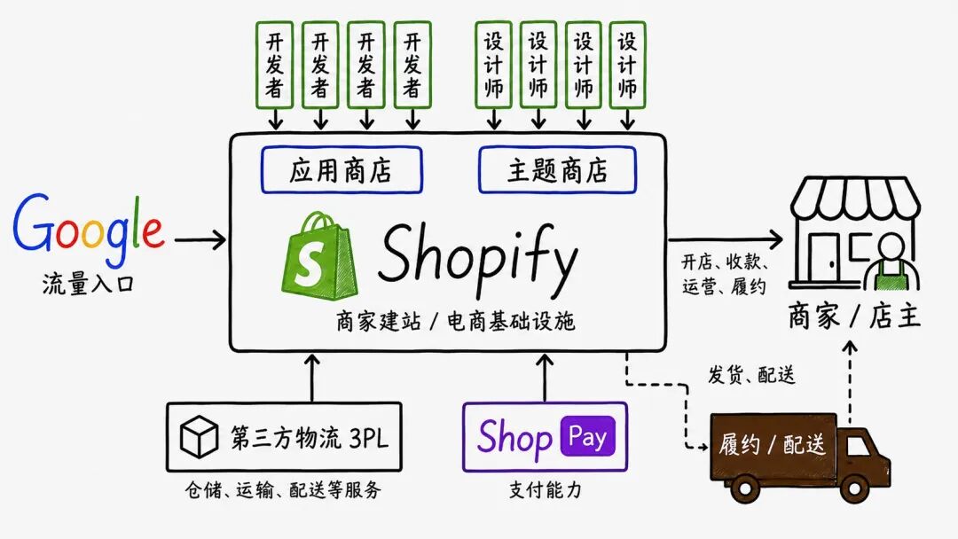 Shopify 能力和合作关系示意图。来源:Ben Thompson、晚点、ChatGPT