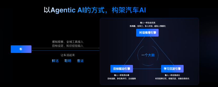 火山引擎将对话推理引擎、目标驱动引擎、学习成长引擎三大引擎融入统一的 “汽车大脑”。