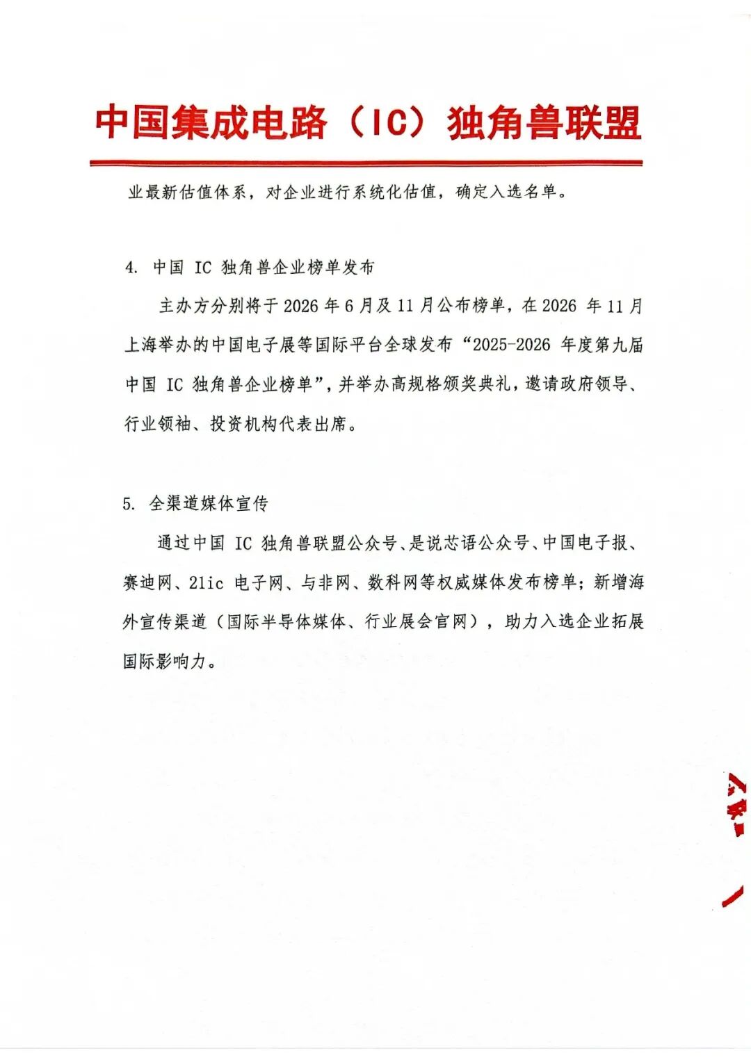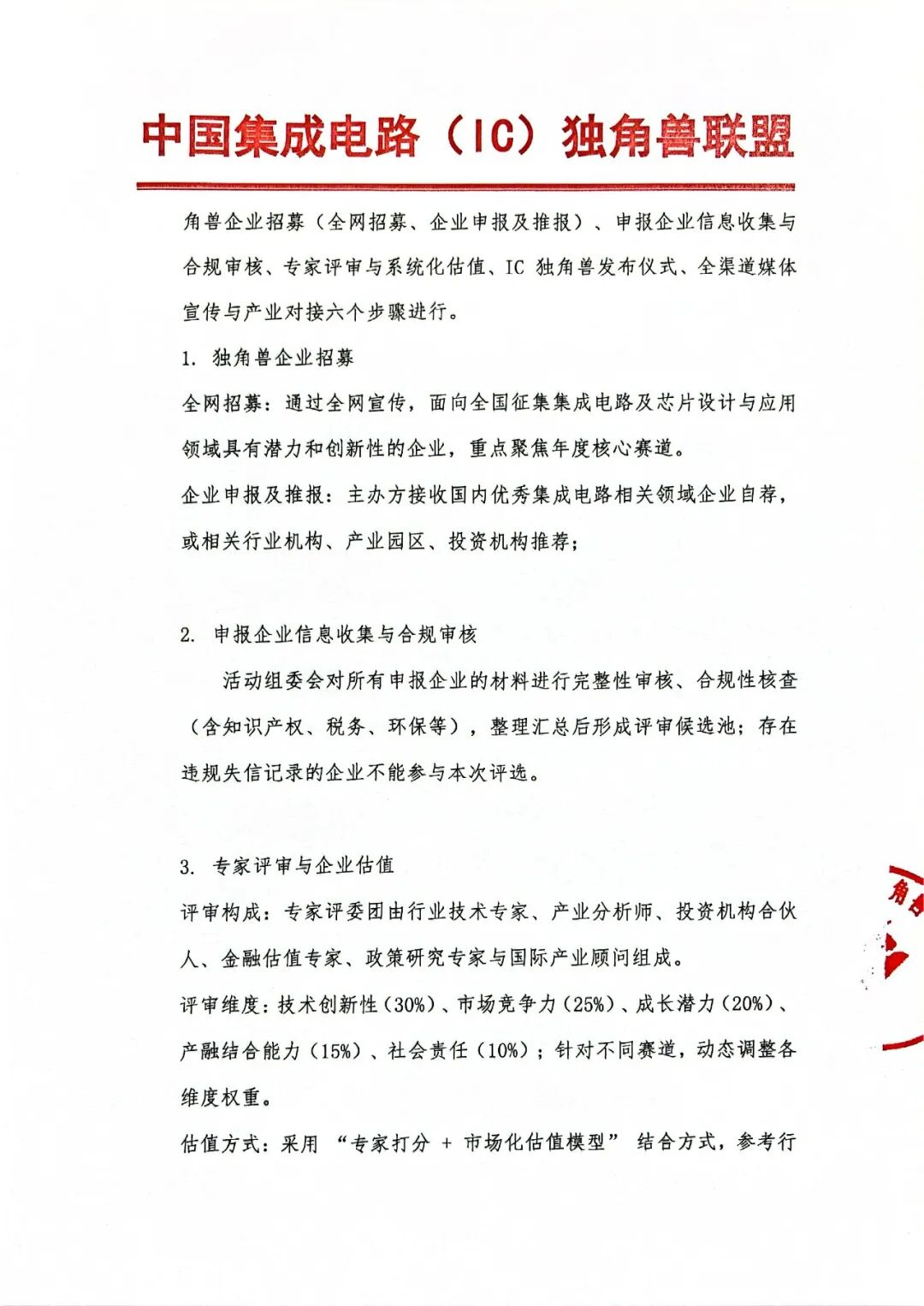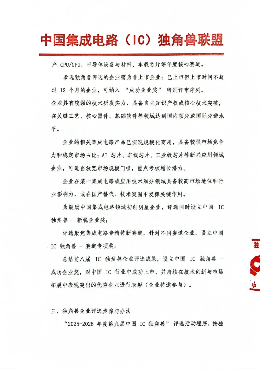 “2025-2026 年度第九届中国 IC 独角兽” 评选活动程序,按独角兽企业招募(全网招募、企业申报及推报)、申报企业信息收集与合规审核、专家评审与系统化估值、IC 独角兽发布仪式、全渠道媒体宣传与产业对接六个步骤进行。