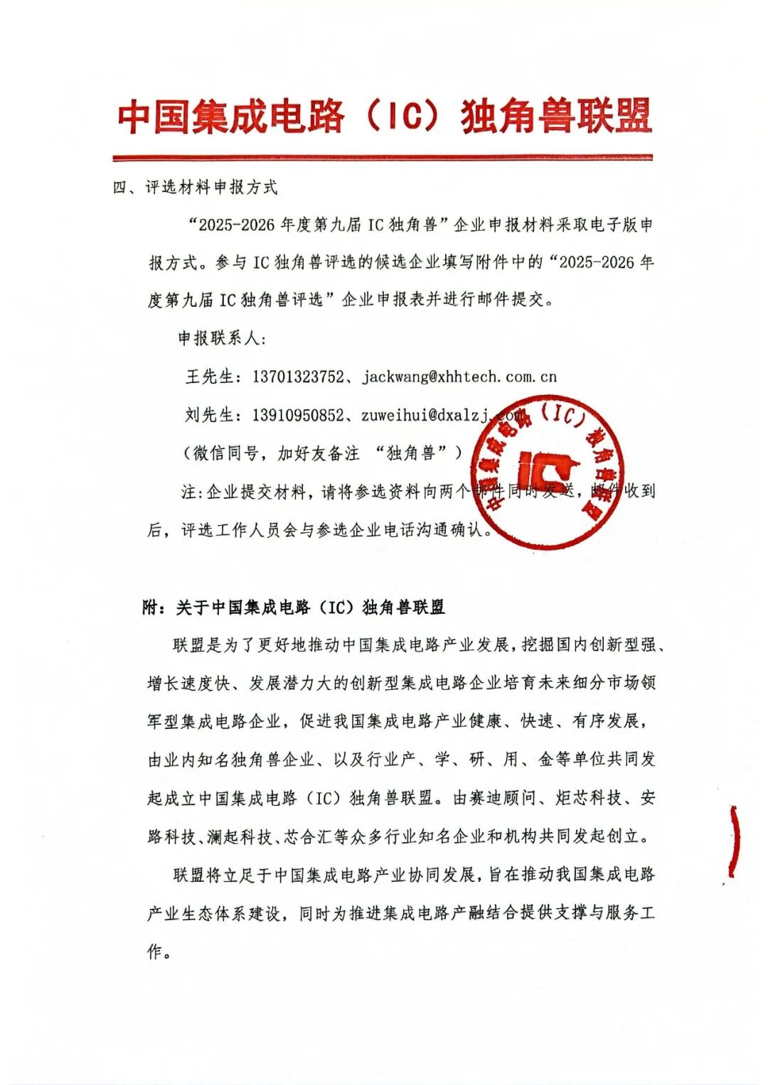 “2025-2026年度第九届IC独角兽”企业申报材料采取电子版申报方式。参与IC独角兽评选的候选企业填写附件中的“2025-2026年度第九届IC独角兽评选”企业申报表并进行邮件提交。申报截止时间为5月30日。