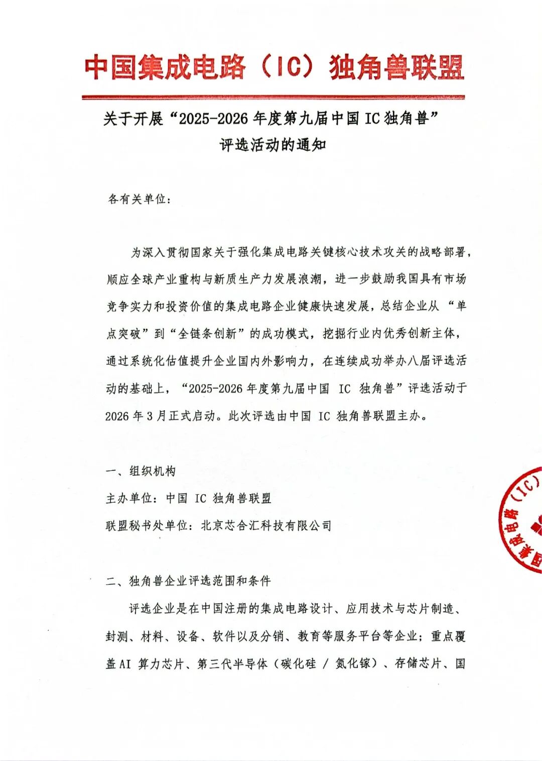 为深入贯彻国家关于强化集成电路关键核心技术攻关的战略部署,顺应全球产业重构与新质生产力发展浪潮,进一步鼓励我国具有市场竞争实力和投资价值的集成电路企业健康快速发展,总结企业从 “单点突破” 到 “全链条创新” 的成功模式,挖掘行业内优秀创新主体,通过系统化估值提升企业国内外影响力,在连续成功举办八届评选活动的基础上,“2025-2026 年度第九届中国 IC 独角兽” 评选活动于 2026 年 3 月正式启动。此次评选由中国 IC 独角兽联盟主办。