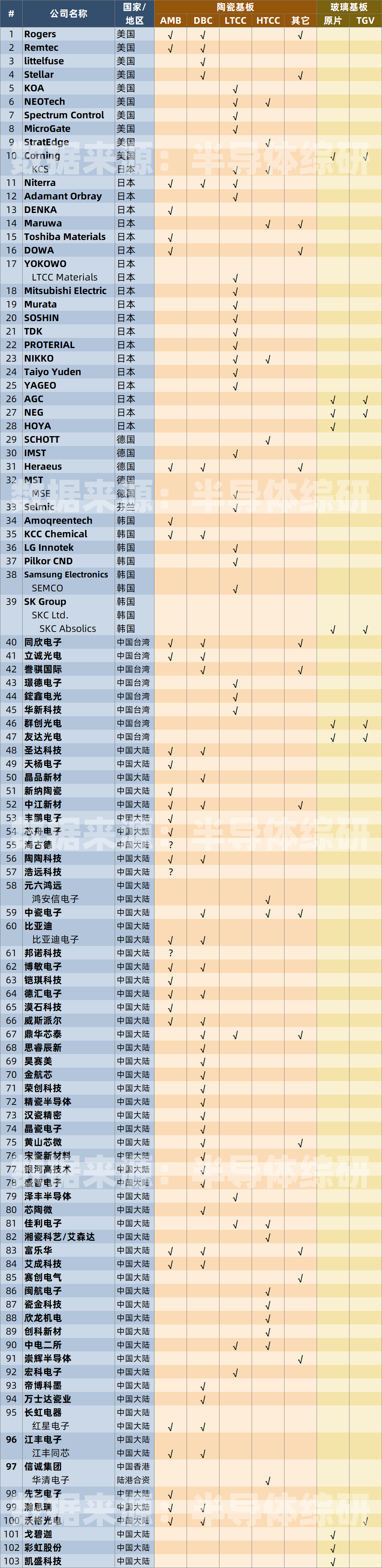 最近虽然有点小忙,但还是在抽空收集整理各种新的行业数据先进封装话题火了以后,不少朋友和我打听玻璃基板相关领域的事情,我这才发现我一直以来都还没有整理相关的供应商信息。于是我这几天抓紧时间做了一个版本尽快发布由于时间仓促,我目前还只能收集到主要几家龙头企业,可能错过一些二三线供应商,麻烦大家理解;另外在环节区分上,我主要分为原片材料和TGV两类(TGV同时包含金属化、RDL等工序)同时,我也把之前收集的陶瓷基板的供应商也一并列出,方便大家一起参考。由于陶瓷基板的种类较多,我也做了一些合并名词解释: