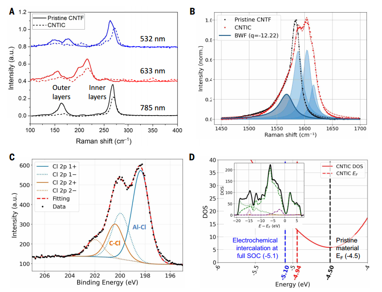 研究证实DWCNT与AlCl4⁻间存在强烈非共价相互作用,发生大规模电荷转移,每个阴离子接受0.65个电子,费米能级降低0.44 eV,电导率跃升17.4倍。