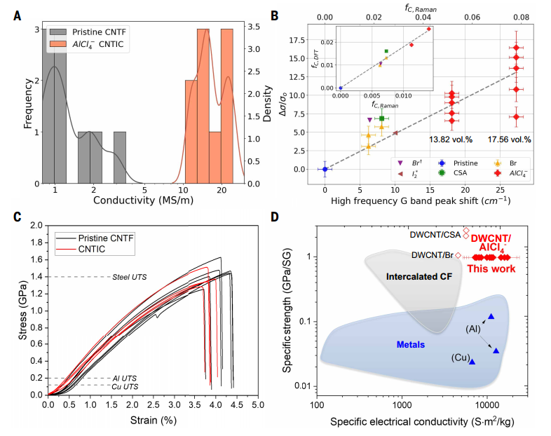 研究通过在双壁碳纳米管纤维中均匀插层AlCl4⁻,实现了高达17,345 S·m2/kg 的比电导率,显著超过了传统的铜和铝,且导电率提升幅度高达17.5倍。