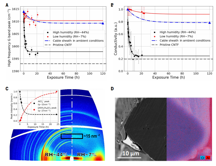 插层纤维的稳定性与环境湿度密切相关。在干燥条件(如手套箱,RH < 0.05%)下,纤维的性能非常稳定,保存时间可超过一年。然而,当直接暴露在潮湿空气中时,AlCl4-会与水分子反应生成六水合氯化铝 [Al(H2O)6]Cl3,导致电荷转移效应逆转,电导率随之下降。为了解决这一应用瓶颈,研究者展示了有效的封装保护策略:将插层纤维置于商用聚合物电缆护套中并进行热密封,在平均湿度为44%的环境中暴露5天后,其电导率仍能保持初始值的78%。此外,使用电子级硅胶进行表面涂覆也能显著减缓性能衰减。研究认为,通过在纤维表面形成自钝化层或采用更稳定的电荷受体,可以进一步提升其在复杂环境下的长期稳定性。目前的封装技术已初步证明了该材料在实际电力传输应用中的可行性。
