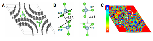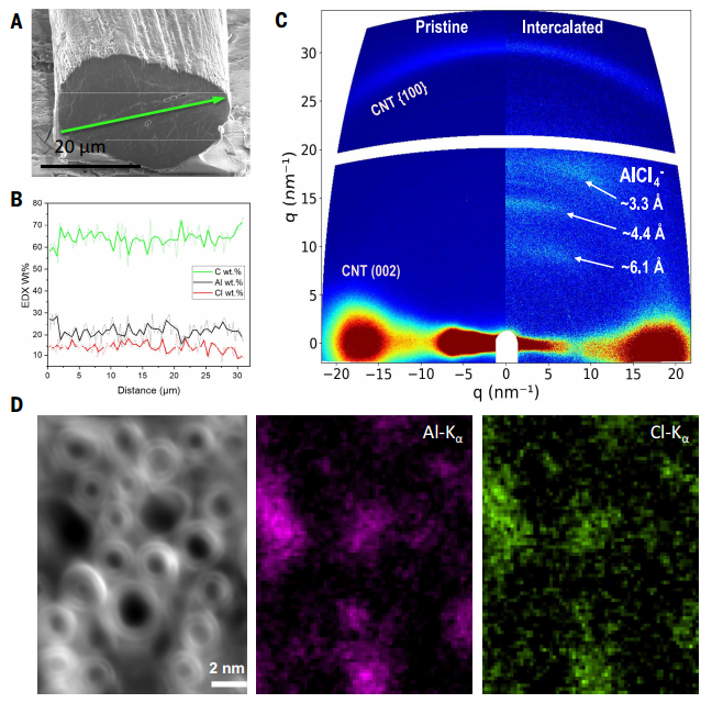 作者利用两区气相法将AlCl4⁻嵌入DWCNT纤维,形成独特双嵌套晶格结构,避免体积膨胀和脆化,插层剂分布均匀,纤维保持柔韧性,DFT揭示阴离子稳定亚稳态超结构。