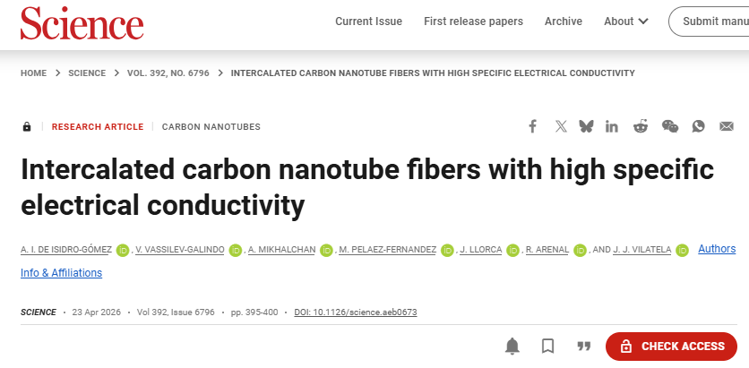 A. I. DE ISIDRO-GÓMEZ, et al. Intercalated carbon nanotube fibers with high specific electrical conductivity. Science, 2026, 392(6796):395-400.