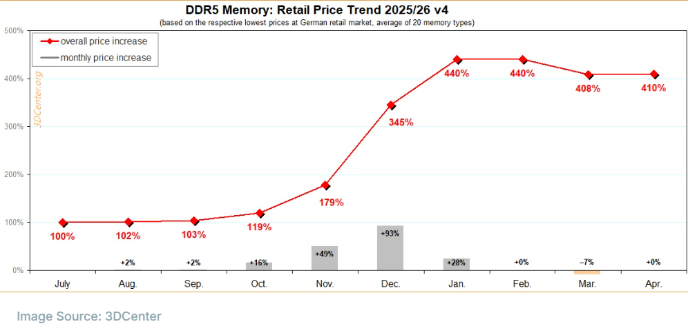 回顾上月,德国市场的DDR5平均价格出现了自去年7月以来的首次下跌。但目前德国DDR5内存套件的平均价格又恢复到2025年7月水平的410%,虽未达到今年1月和2月内存价格峰值时的水平,但在3月出现明显下降后,正当人们以为内存价格将进一步走低时,最新零售价格却打破了这一预期。