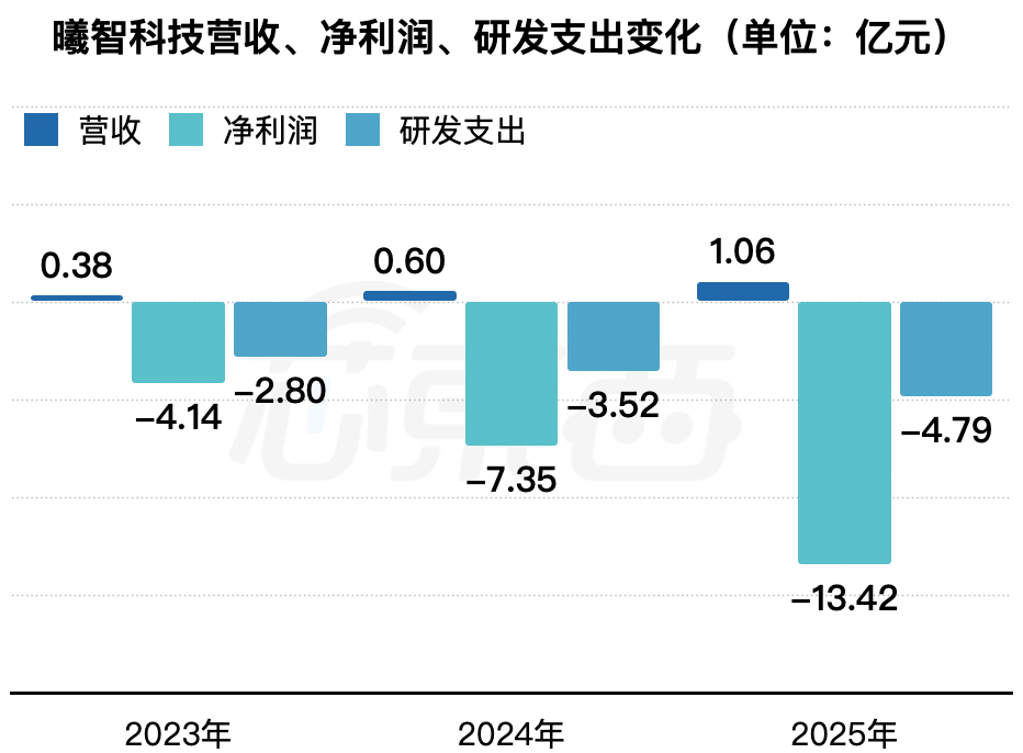2023年、2024年、2025年,曦智科技收入分别为0.38亿元、0.60亿元、1.06亿元,净亏损分别为4.14亿元、7.35亿元、13.42亿元,研发费用分别为2.80亿元、3.52亿元、4.79亿元。 ▲2023年~2025年曦智科技收入、净利润、研发支出变化(芯东西制图)