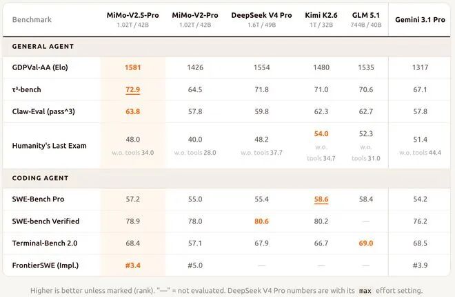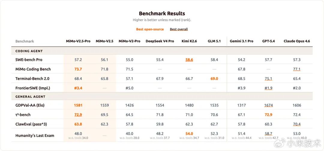 ·GDPVal-AA(Elo):MiMo-V2.5-Pro以1581分、MiMo-V2.5以1559分位列全球开源模型第一;