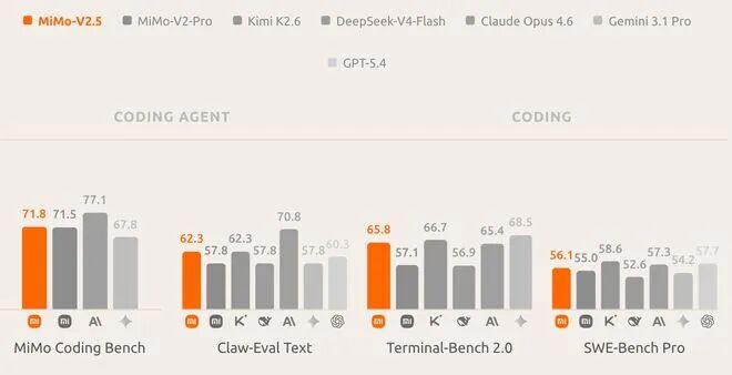 根据小米官方公布的Benchmark Results及多家媒体报道,MiMo-V2.5系列在多项权威测评中表现突出: