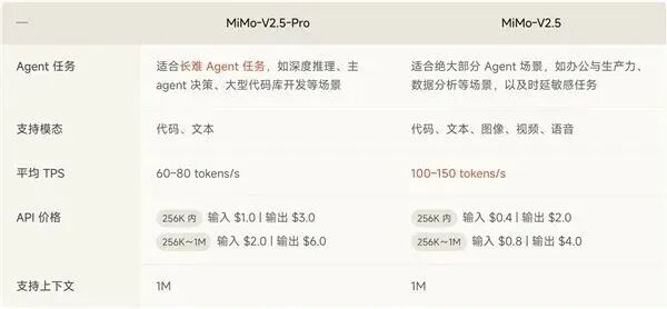 MiMo-V2.5系列包含两款模型,均支持100万Token超长上下文窗口,但定位各有侧重:
